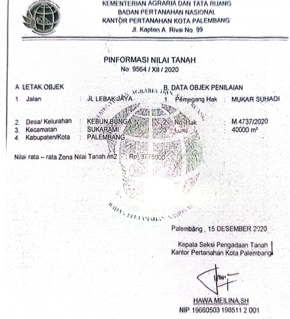 Menurut Feri, BPN Kota Palembang justru memperkuat legalitas sertifikat tersebut dengan memasukkannya ke dalam aplikasi PINFORMASI, sistem resmi nilai tanah yang digunakan pemerintah, dengan opini harga tanah sebesar Rp3.775.000 per meter persegi.